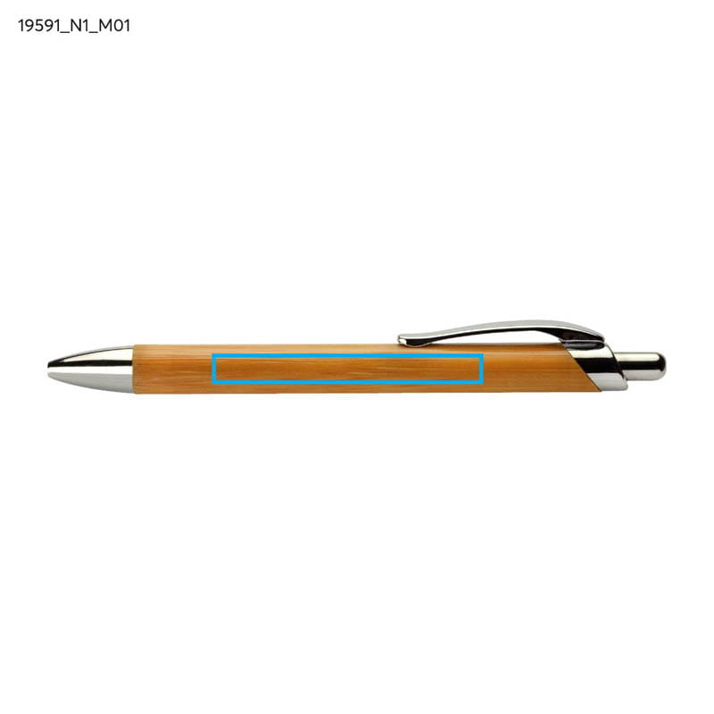 Stilvoller Kugelschreiber mit Bambusgehäuse. Die äußerst angenehme Holzstruktur wird sicherlich die Aufmerksamkeit jedes Kunden auf sich ziehen. Der Kugelschreiber ist mit silberfarbenen Metallelementen veredelt. Eine Kennzeichnung ist auf dem Bambusgehäuse möglich.