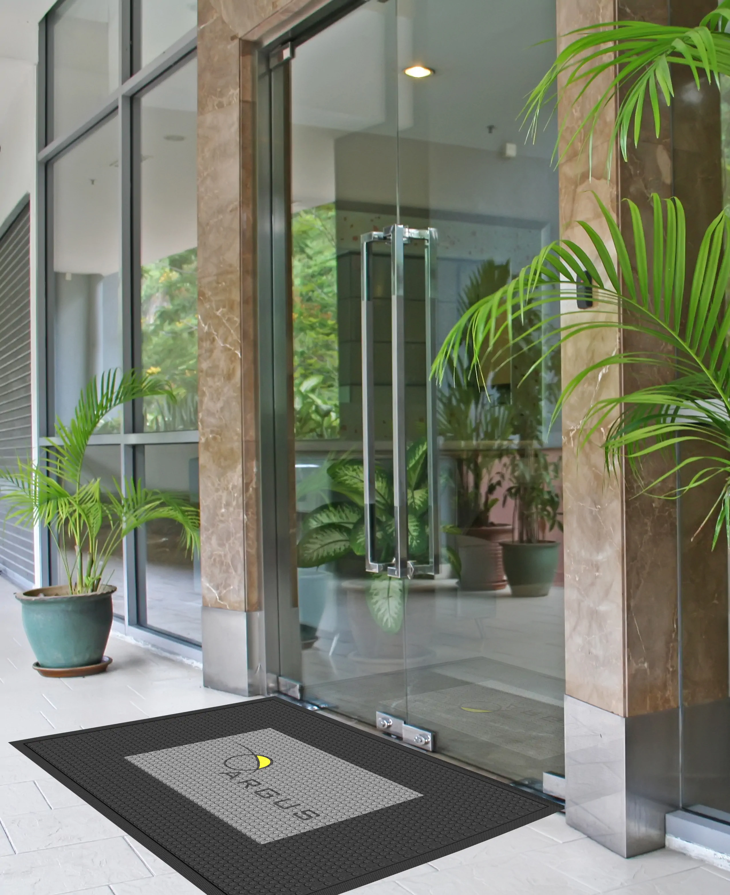 Wir bieten 5 Standardgrößen von Matten an, die an verschiedene Bedürfnisse und Eingangsmessungen angepasst werden können. Zusätzlich ist ein fotorealistischer Druck möglich, der in einer Palette von 80 Standardfarben ausgeführt werden kann, wodurch Ihnen ein breites Spektrum an Personalisierungsmöglichkeiten zur Verfügung steht.