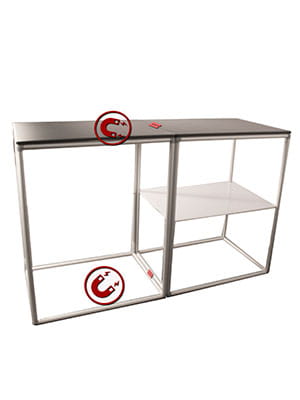 Dieses zusammengebaute Thekenmodul kann einfach durch Zusammenrücken mit einem identischen Modul verbunden werden. Die in den Profilen versteckten Magnete ermöglichen die Bildung einer größeren einheitlichen Struktur.