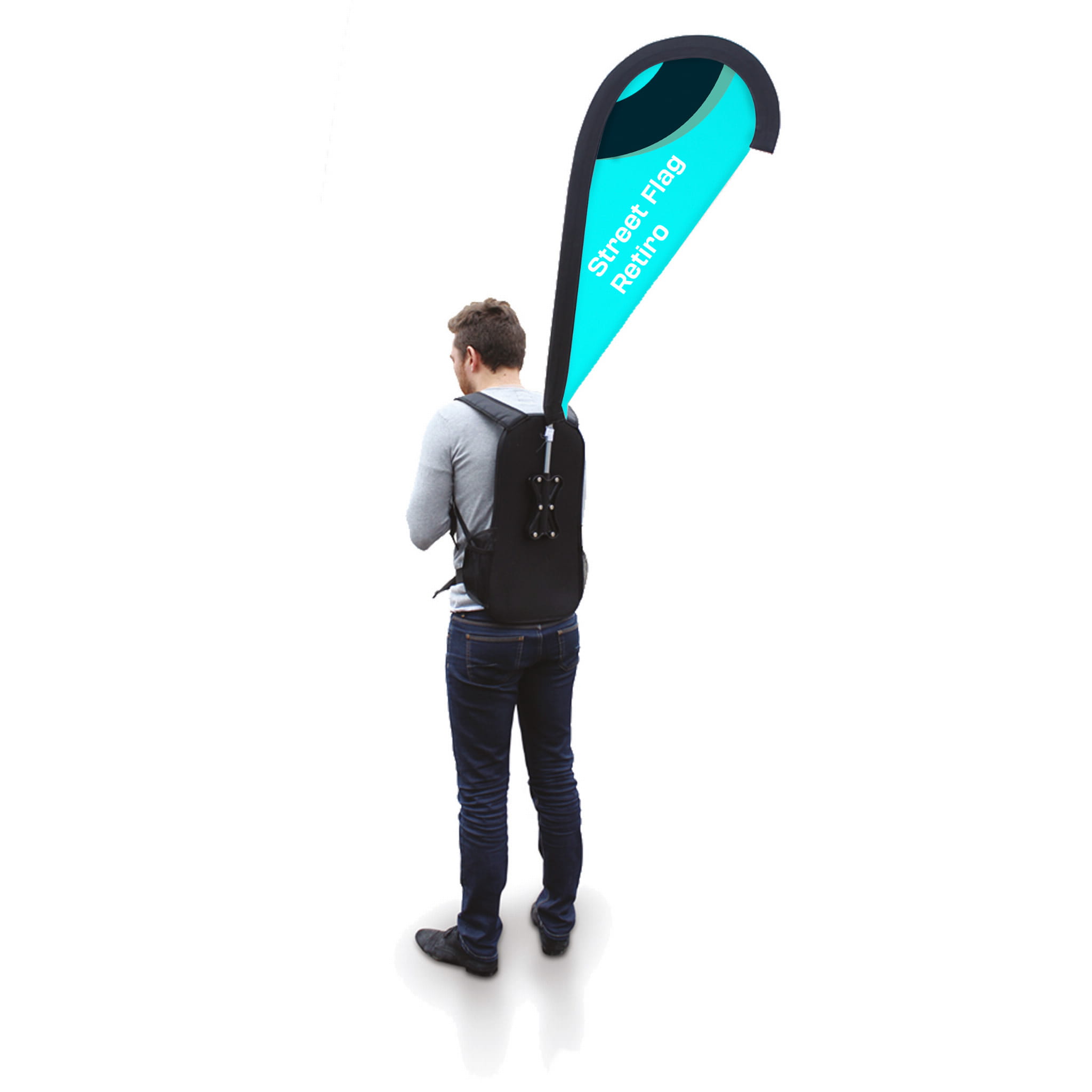 Der Rucksack verfügt über verstärkte Träger für einen bequemen Gebrauch sowie ein stabiles Befestigungssystem für die Fahne, das ein Brechen beim ersten Windstoß verhindert. Außerdem besitzt er Seitentaschen (z.B. für Werbegadgets), einen verstellbaren oberen und unteren Gurt mit Clip-Schnallen auf Brust- und Taillenhöhe. Die Haupttasche wird mit einem Reißverschluss geschlossen, um Sicherheit zu gewährleisten. Das Einzige, was dieses System nicht enthält, ist die Person :)