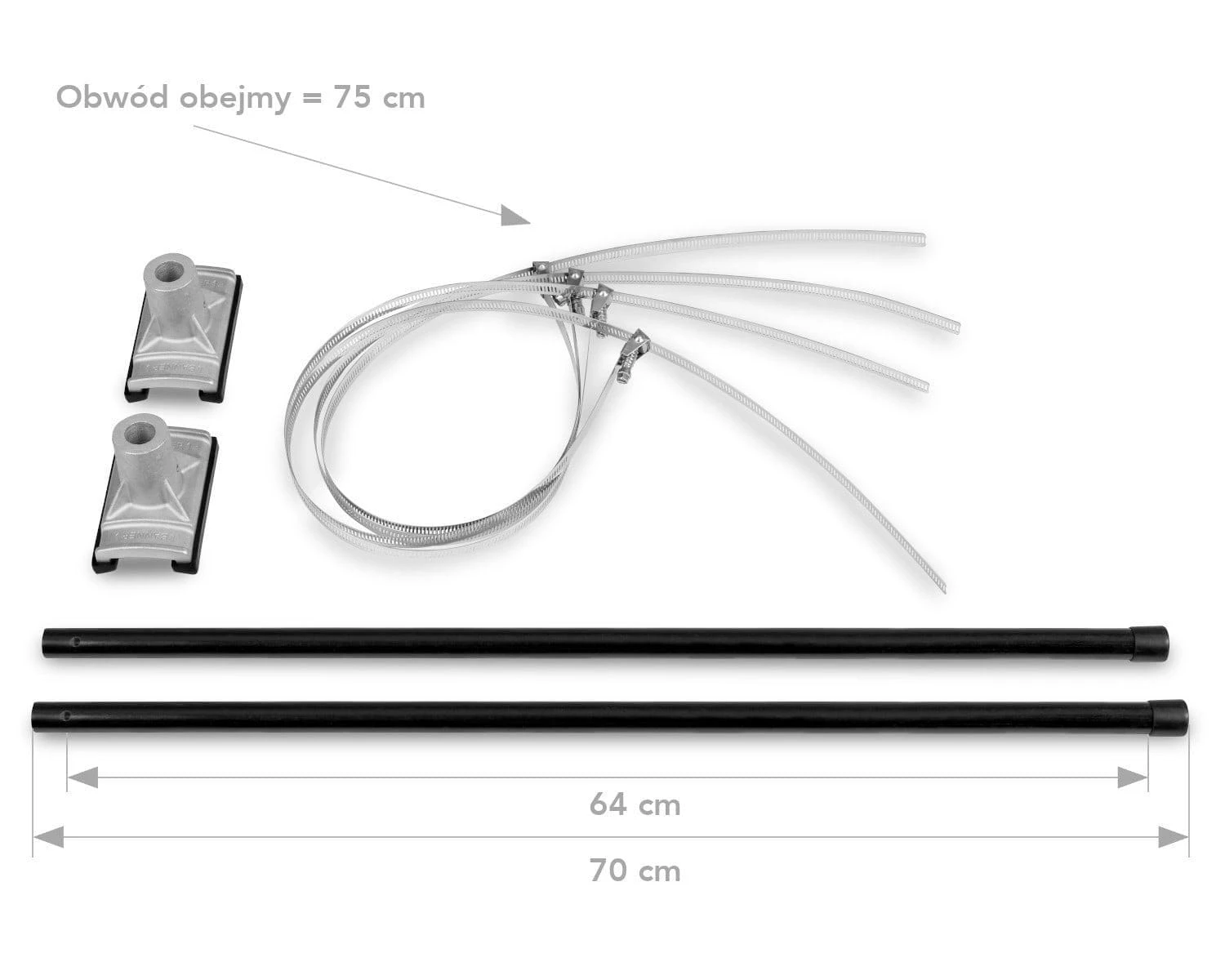 Der Bausatz enthält alle für die Montage notwendigen Komponenten, darunter Gummidichtungen, Metallklammern und Kabelbinder.
